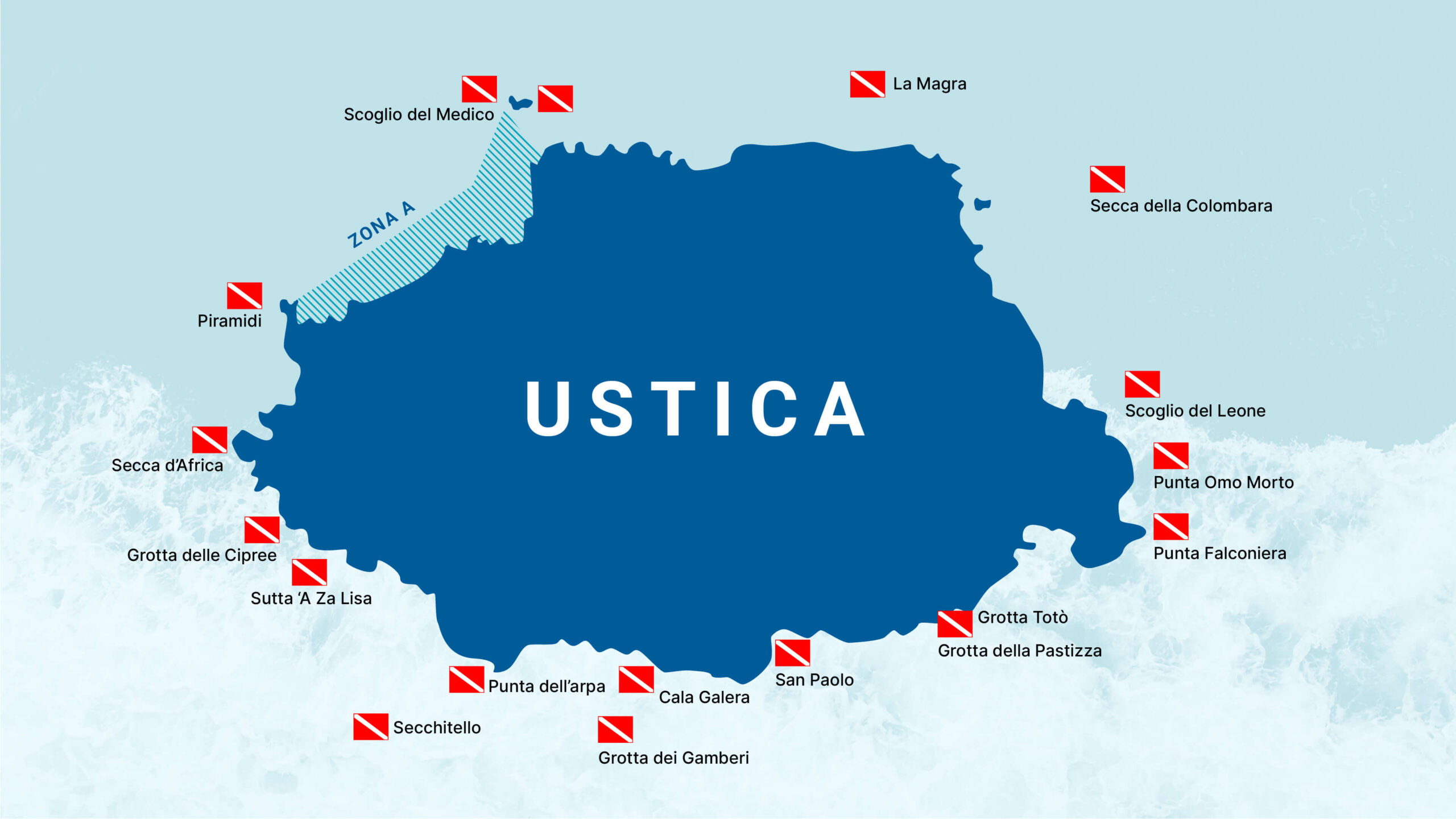 A circa 6 miglia a ovest dal porto di Ustica, a circa 350 m dal faro di Punta Spalmatore, tra i 9 e i 12 metri di profondità, si trovano i tre pinnacoli della famosa “Secca d’Africa”.